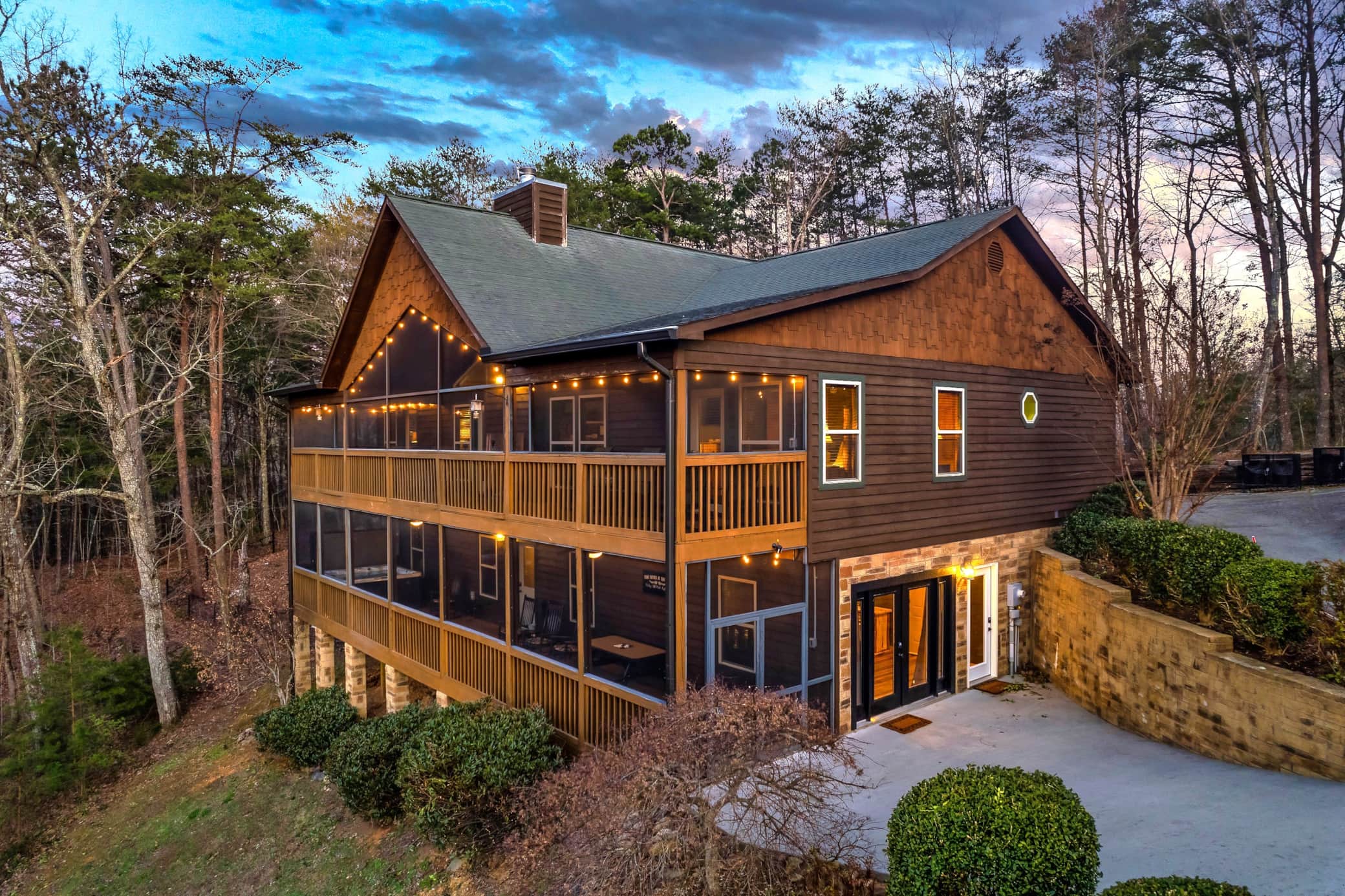 * String lights in screened porches and carport create magical evenings